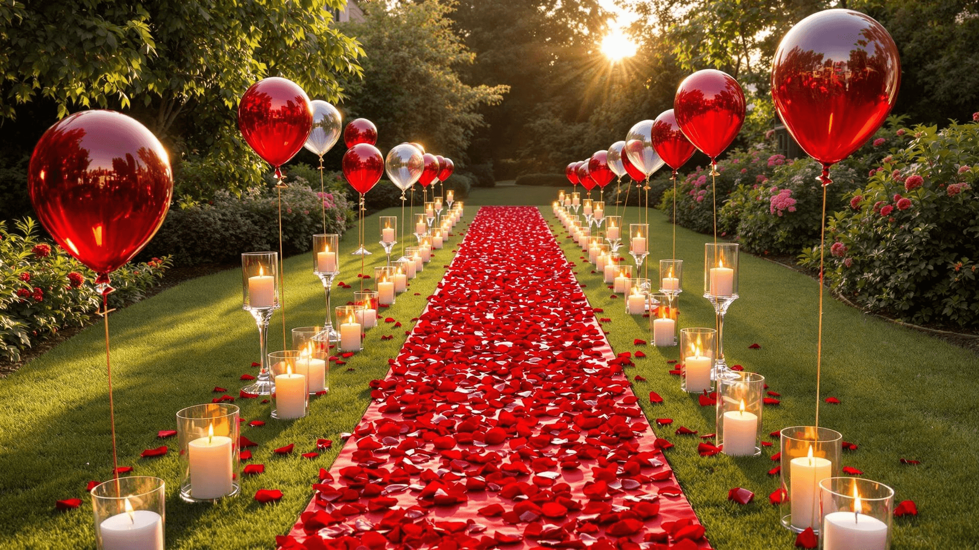 This package includes 1 dozen balloons to line up the aisle with silk cluster roses, featuring petals along the aisle leading up to a rose-shaped heart on the ground, surrounded by tea light candles.