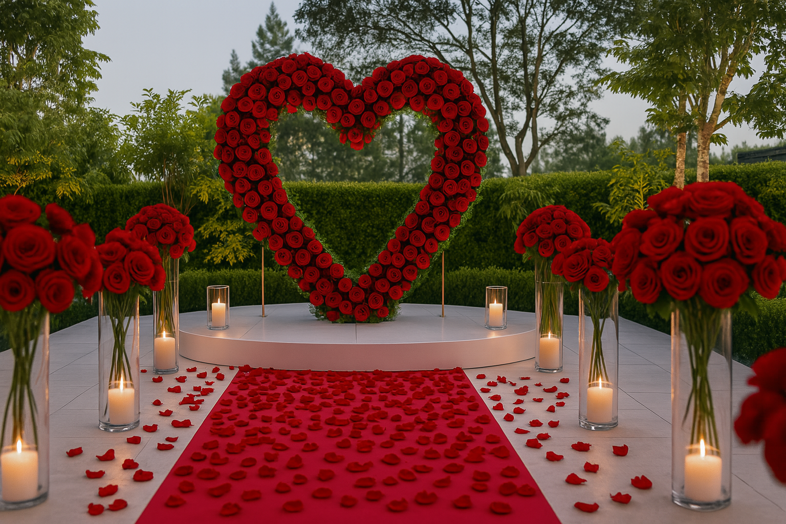 This package includes a red carpet with silk rose petals to line up both sides of the aisle runner. The aisle runner is traced with white LED candles, which leads up to a large 8-foot heart-shaped arch covered in silk red roses.